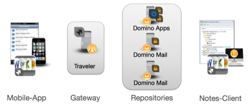 The app connects via SSL with one of your provided and from the internet reachable Domino Server (like your present Traveler Server). Onto this system the doc.Store gateway will be installed as an additional component. The gateway is responsible for the synchronization and access the present repositories on any internal Domino Server.